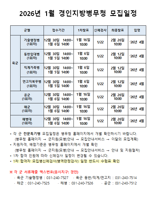 * 2026년 1월 경인지방병무청 모집병 접수일정을 알려드리니, 많은 지원 바랍니다. 아울러, 내년도부터 달라지는 제도를 알려드리니 첨부파일 참고 바랍니다.