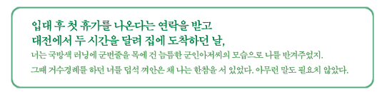 ÀÔ´ë ÈÄ Ã¹ ÈÞ°¡¸¦ ³ª¿Â´Ù´Â ¿¬¶ôÀ» ¹Þ°í ´ëÀü¿¡¼ µÎ ½Ã°£À» ´Þ·Á Áý¿¡ µµÂøÇÏ´ø ³¯, ³Ê´Â ±¹¹æ»ö ·¯´×¿¡ ±º¹øÁÙÀ» ¸ñ¿¡ °Ç ´Æ¸§ÇÑ ±ºÀξÆÀú¾¾ÀÇ ¸ð½ÀÀ¸·Î ³ª¸¦ ¹Ý°ÜÁÖ¾úÁö. ±×¶§ °Å¼ö°æ·Ê¸¦ ÇÏ´ø ³Ê¸¦ ´þ¼® ²¸¾ÈÀº ä ³ª´Â ÇÑÂüÀ» ¼ ÀÖ¾ú´Ù. ¾Æ¹«·± ¸»µµ ÇÊ¿äÄ¡ ¾Ê¾Ò´Ù.