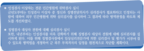 Áö±Ý±îÁöÀÇ Àμº°Ë»ç´Â º´¹«Ã»ÀÇ ÀϹÝÁ÷¿ø¿¡ ÀÇÇØ ½Ç½ÃÇØ ¿È¿¡ µû¶ó Àü¹®¼ºÀ̳ª ½Å·Ú¼º¿¡ ¸¹Àº ¹®Á¦°¡ Á¦±âµÇ¾î ¿ÔÀ¸¸ç, Àμº°Ë»ç Àü¹®°¡ ºÎÀç·Î ÀÎÇØ Àü¹®ÀûÀÎ ÀÓ»ó¼Ò°ß¿¡ ´ëÇÑ ºÐ¼® ¹× Æò°¡°¡ ÀÌ·ç¾îÁöÁö ¸øÇϰí Çü½ÄÀûÀÎ °Ë»ç¿¡ ±×Ä£ ¸éÀÌ ¾øÁö ¾Ê¾ÒÀ½À» ºÎÀÎÇÒ ¼ö ¾ø´Ù. µû¶ó¼ ´ÊÀº °¨ÀÌ ¾øÁö ¾ÊÁö¸¸ Áö³ ÇØ Àü¹æ GP Ãѱ⳻ç»ç°ÇÀ» °è±â·Î ´ÙÀ½°ú °°ÀÌ Àμº°Ë»ç °È ¹æ¾ÈÀ» ¸¶·ÃÇÏ°Ô µÇ¾ú´Ù.