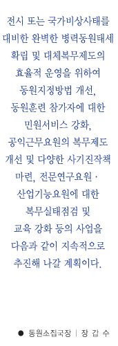 ¶Ç´Â ±¹°¡ºñ»ó»çŸ¦ ´ëºñÇÑ ¿Ïº®ÇÑ º´·Âµ¿¿øÅ¼¼ È®¸³ ¹× ´ëüº¹¹«Á¦µµÀÇ È¿À²Àû ¿î¿µÀ» À§ÇÏ¿© µ¿¿øÁöÁ¤¹æ¹ý °³¼±, µ¿¿øÈÆ·Ã Âü°¡ÀÚ¿¡ ´ëÇÑ ¹Î¿ø¼ºñ½º °È, °øÀͱٹ«¿ä¿øÀÇ º¹¹«Á¦µµ °³¼± ¹× ´Ù¾çÇÑ »ç±âÁøÀÛÃ¥ ¸¶·Ã, Àü¹®¿¬±¸¿ä¿ø¡¤»ê¾÷±â´É¿ä¿ø¿¡ ´ëÇÑ º¹¹«½ÇÅÂÁ¡°Ë ¹× ±³À° °È µîÀÇ »ç¾÷À» ´ÙÀ½°ú °°ÀÌ Áö¼ÓÀûÀ¸·Î ÃßÁøÇØ ³ª°¥ °èȹÀÌ´Ù.