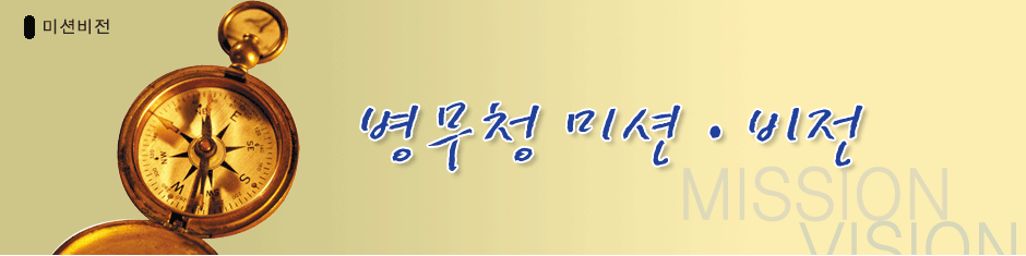 ¹Ì¼Ç(Mission)À̶ó ÇÔÀº ±× Á¶Á÷ÀÌ Á¸ÀçÇÏ´Â ÀÌÀ¯, Áï Á¶Á÷ÀÇ »ç¸í ¶Ç´Â ÀÓ¹«¸¦ ¸»ÇÑ´Ù. ÈçÈ÷ ¾ß°£¿¡ Ç×ÇØÇÏ´Â ¹è¿¡ ÀÖ¾î º°ºûÀ̳ª µî´ë, ³ªÄ§¹Ý µî¿¡ ºñÀ¯µÇ±âµµ Çϸç, ÇâÈÄ 50-100³âÀÌ Áö³ªµµ °áÄÚ ´Þ¼ºÇϱ⠽±Áö ¾ÊÀº ¸ñÇ¥¶ó°íµé ÇÑ´Ù. ¿ì¸® º´¹«Ã»ÀÇ °æ¿ì Áö±Ý±îÁö °ø½ÄÀûÀ¸·Î ¹Ì¼ÇÀ» Á¤ÇÏ¿© °ü¸®ÇÏÁö´Â ¾Ê¾ÒÁö¸¸ ±»ÀÌ À¯»çÇÑ »ç·Ê¸¦ ã´Â´Ù¸é, Á¤ºÎÁ¶Á÷¹ý Á¦33Á¶ÀÇ ¡°º´¹«Ã»Àº ¡Áý¡¤¼ÒÁý ±âŸ º´¹«ÇàÁ¤¿¡ °üÇÑ »ç¹«¸¦ °üÀåÇÑ´Ù¡±¶ó°í ÇÒ ¼ö ÀÖ°Ú´Ù.