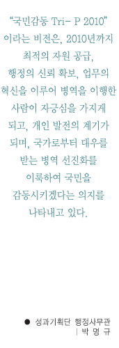 ºñÀü(Vision)À̶ó ÇÔÀº Á¶Á÷ÀÇ ¹Ì¼ÇÀ» ´Þ¼ºÇϱâ À§ÇÑ ÁßÀå±âÀÇ Àü·«¸ñÇ¥, Áï ÀÌ·ç°íÀÚ ÇÏ´Â ¹Ì·¡»óÀ» ¸»ÇÑ´Ù. Åë»ó ¸ñÇ¥ ´Þ¼º ±â°£Àº 5-10³âÀ» Àâ´Â´Ù. ¿ì¸® º´¹«Ã»ÀÇ °æ¿ì ¾à 5-8³âÀ» ÁÖ±â·Î °ü¸®ÇÏ´ø º´¹«ÇàÁ¤ ÁöÇ¥°¡ ºñÀü¿¡ °¡±õ´Ù°í ÇÒ ¼ö ÀÖ°Ú´Ù. 1998-2002³âÀÇ ¡°º´¿ªÁ¦µµ °³¼±¡±, ¡°Àǹ«ºÎ°úÀÇ °øÁ¤¡±, ¡°µ¿¿øÅ¼¼ÀÇ È®¸³¡±, ¡°±¹¹ÎÆíÀÍÀÇ ÁõÁø¡±, ¡°È«º¸È°µ¿ÀÇ °È¡± µî º´¹«ÇàÁ¤ÁöÇ¥¿Í 2004-2005³âÀÇ ¡°±¹¹Î°ú ÇÔ²²ÇÏ´Â °Ç°ÇÑ º´¿ª¹®È Á¤Âø¡±À̶ó´Â º´¹«ÇàÁ¤ ¸ñÇ¥ µîÀÌ ±×°ÍÀÌ´Ù. ±×·¯³ª ¿©±â¿¡´Â ¸ñÇ¥´Þ¼º ±â°£ÀÌ ¸í½ÃµÇ¾î ÀÖÁö ¾Ê¾Æ ÁøÁ¤ÇÑ ºñÀüÀ̶ó°í º¸±â´Â ¾î·Æ´Ù.