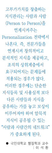 ÀÌ·¯ÇÑ Áö½Ä°ü¸®½Ã½ºÅÛÀÌ Á¶Á÷ÀÇ Áß¿äÇÑ ¿£ÁøÀ¸·Î °¡µ¿µÇ±â À§Çؼ´Â À§¿¡¼ ¾ð±ÞÇÑ ³»¿ëµéÀ» °í·ÁÇÏ¿© °¡Ä¡ ÀÖ´Â Á¤º¸¿Í Áö½ÄµéÀÌ °øÀ¯½Ã½ºÅÛ¿¡ °¡µæÂ÷°í, ÀÌ·¯ÇÑ Á¤º¸µéÀÌ ¼ö½Ã·Î ¾÷µ¥ÀÌÆ®µÉ ¼ö Àִ ȯ°æÀ» Á¶¼ºÇÏ°í ´Ù¾çÇÑ Àμ¾Æ¼ºê¸¦ Á¦°øÇÏ´Â °ÍÀÌ Áß¿äÇÏ´Ù.