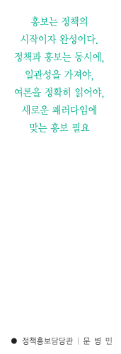 ¿ì¼± Á¤Ã¥È«º¸ÀÇ °³³äÀ» ¸íÈ®È÷ ÇÒ Çʿ䰡 ÀÖ´Ù. Á¤Ã¥È«º¸¶õ °áÁ¤µÈ Á¤Ã¥À» ÀϹæÀûÀ¸·Î ¾Ë¸®´Â °ÍÀÌ ¾Æ´Ï¶ó, ¿Ã¹Ù¸¥ ¿©·ÐÀ» Áø´ÜÇϰí Á¤Ã¥¿¡ À̸¦ ¹Ý¿µÇØ ¾Ë¸®´Â °ÍÀ¸·Î Á¤Ã¥ÀÇ ÀÔ¾È, Çü¼º, ÁýÇà, Æò°¡ µî Á¤Ã¥ÀÇ ´Ü°è¿¡¼ ±¹¹Î°úÀÇ ½Ö¹æÇâ Ä¿¹Â´ÏÄÉÀ̼ÇÀ» ¼öÇàÇϱâ À§ÇÑ ¸ðµç Ȱµ¿À» ÀǹÌÇÑ´Ù.