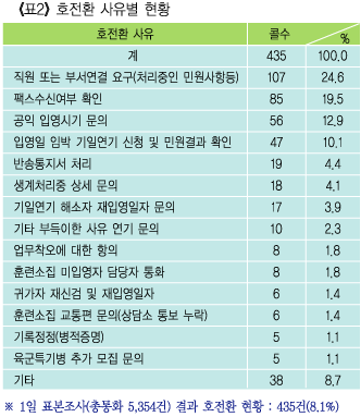 À§ ¡¶Ç¥2¡·ÀÇ È£Àüȯ »ç·Ê¸¦ ºÐ¼®ÇØ º¸¸é ¹Î¿ø¼·ù ó¸®ÁßÀÎ »ç¾È°ú °ü·ÃÇÏ¿© ´ã´çÁ÷¿ø ¶Ç´Â ºÎ¼ ¿¬°á¿ä±¸, ÀÔ¿µ°¡´ÉÀÏÀÚ ¹®ÀÇ, »ý°èó¸®Áß »ó¼¼¹®ÀÇ, ÀÔ¿µÀÏ ÀÓ¹Ú ¹Î¿ø°á°ú È®ÀÎ µî Áö¹æÃ» ´ã´çÀÚ°¡ È®ÀÎ, °áÁ¤ÇÒ ¼ö ÀÖ´Â »ç¾ÈÀÌ ´ëºÎºÐÀ» Â÷ÁöÇϰí ÀÖ´Ù. À̸¦ °³¼±Çϱâ À§ÇÏ¿© ¾÷¹«ºÐ¾ßº° »ç·ÊºÐ¼®À» ÅëÇØ ÅëÀÏµÈ Ç¥ÁؾÈÀ» ¸¶·ÃÇϰí ÀÖÀ¸¸ç Áö¹æÃ» ½Ç¹«ÀÚ È®ÀÎÀ» ¿äÇÏ´Â »çÇ׿¡ ´ëÇØ ÀÌÀ¯ ¼³¸í ¹× Re-CallÀ» ÅëÇØ Áö¹æÃ» ½Ç¹«ÀÚ¿ÍÀÇ ¿¬°è½Ã½ºÅÛÀ» ÅëÇØ 5ºÐ ¾È¿¡ Re-CallÀ» ½Ç½ÃÇϰí ÀÖ´Ù.
