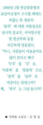 ÇÏÁö¸¸ ±×´Â °³ÀÇÄ¡ ¾Ê¾Ò´Ù. ¾îÂ÷ÇÇ Á¤ÀÇ¿Í À̷οòÀº º´Á¸ °¡´ÉÇÑ °¡Ä¡°¡ ¾Æ´ÔÀ» Àß ¾Ë±â ¶§¹®ÀÌ´Ù. ¿ÀÁ÷ ¡°±¹¾î¸¦ ¾î¹ý¿¡ ¸Â°Ô »ç¿ëÇÏ´Â ÀÏÀº ¿Ç°í ±×¸§ÀÇ ¹®Á¦ÀÌÁö, °áÄÚ ÃëÇâÀ̳ª °³¼º¿¡ µû¸¥ ¼±Åÿµ¿ªÀÌ µÉ ¼ö ¾ø´Ù¡±´Â °ÍÀÌ ±×ÀÇ ÁÖµÈ °ü½É»çÀÌÀÚ È®°íÇÑ ½Å³äÀ̾ú´Ù.
