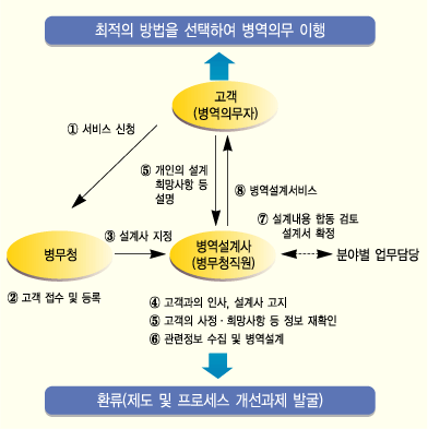 º´¿ª¼³°è»ç¼ºñ½º Á¦µµ´Â 2004³â ÀÎõ¡¤°æ±âûÀÇ Çõ½Å°æÁø´ëȸ¿¡¼ óÀ½ Á¦¾ÈµÇ¾î ½Ã¹ü ¿î¿µÇÏ´ø °ÍÀ», 2005³âµµ º´¹«Çõ½Å °íÀ¯°úÁ¦·Î ¼±Á¤, ¼ºñ½ºÁ¦°øÀοø 15,000¸í, ¼ºñ½º ¸¸Á·µµ 80Á¡À» ¸ñÇ¥·Î ¼³Á¤¡¤ÃßÁøÇÏ¿© º´¿ª¼³°è¼ºñ½º Á¦°øÀοø 15,957¸í, ½Ç½Ã°£ ¼ºñ½º ¸¸Á·µµ 82.6Á¡À¸·Î ½Ã