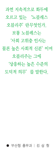 °ú¿¬ Áö¼ÓÀûÀ¸·Î ȵο¡ ¿À¸£°í ÀÖ´Â ¡®³ëºí·¹½º ¿Àºí¸®ÁÖ¡¯¶õ ¹«¾ùÀΰ¡. º¸Åë ³ëºí·¹½º´Â ¡®»çȸ °íÀ§Ãþ Àλç´Â ¹°·Ð ³ôÀº »çȸÀû ½ÅºÐ¡¯ÀÌ¸ç ¿Àºí¸®ÁÖ´Â ±×¿¡ ¡®»óÀÀÇÏ´Â ³ôÀº ¼öÁØÀÇ µµ´öÀû Àǹ«¡¯¸¦ ¸»ÇÑ´Ù.
