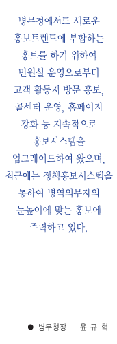 º´¹«Ã»¿¡¼µµ »õ·Î¿î È«º¸Æ®·»µå¿¡ ºÎÇÕÇÏ´Â È«º¸¸¦ Çϱâ À§ÇÏ¿© ¹Î¿ø½Ç ¿î¿µÀ¸·ÎºÎÅÍ °í°´ Ȱµ¿Áö ¹æ¹® È«º¸, Äݼ¾ÅÍ ¿î¿µ, ȨÆäÀÌÁö °È µî Áö¼ÓÀûÀ¸·Î È«º¸½Ã½ºÅÛÀ» ¾÷±×·¹À̵åÇÏ¿© ¿ÔÀ¸¸ç, ÃÖ±Ù¿¡´Â Á¤Ã¥È«º¸½Ã½ºÅÛÀ» ÅëÇÏ¿© º´¿ªÀǹ«ÀÚÀÇ ´«³ôÀÌ¿¡ ¸Â´Â È«º¸¿¡ ÁÖ·ÂÇϰí ÀÖ´Ù.
