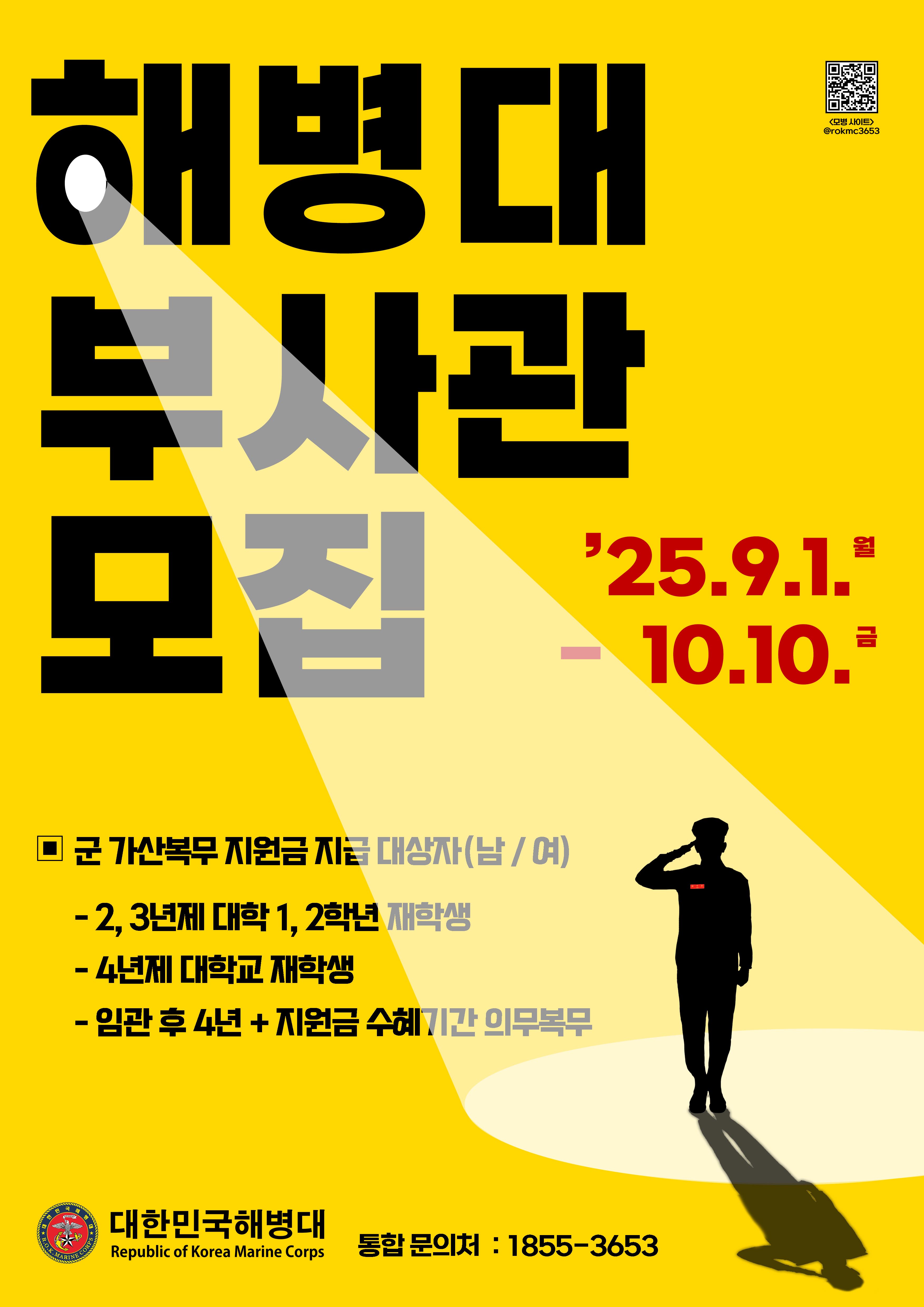 | 이전글 ▼ | (해병대) 25-2차 학군부사관후보생(RNTC) 모집계획 |