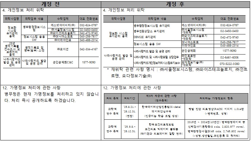 병무청은 다음과 같이 개인정보 처리업무를 위탁하고 있습니다.