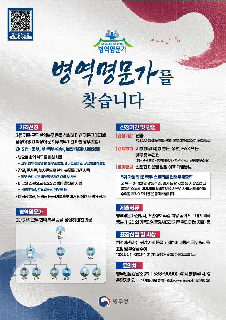 ![]() 2026년도「병역명문가」를 찾습니다. 1. 신청자격 • 3代 가족 모두 현역복무 등을 성실히 마친 가문(3대에 남성이 없고 여성이 현역 의무복무기간 마친 경우 포함) * 3代가족 : 조부, 부·백부·숙부, 본인·형제·사촌형제 - 병으로 현역복무를 마친 사람 * 전투·의무·해양경찰, 의무소방원, 경비교도대원, 상근예비역 포함 - 장교, 준사관, 부사관으로 현역복무를 마친 사람 * 복무 중인 경우 의무복무기간 경과 시 가능 - 비군인 신분으로 6.25 전쟁에 참전한 사람 * 국민방위군, 학도의용군, 역무원 등 - 한국광복군, 독립군 등 국가보훈부에서 인정한 독립유공자 2. 신청기간 및 방법 • 신청기간 : 연중 접수 • 신청방법 : 병무청 누리집(병무민원>병역명문가>병역명문가 신청>(병무청 e-병무지갑 앱 설치 필요)간편인증, 또는 지방병무(지)청 방문, 우편 등 • 결과통보 : 신청한 다음달 말일 이후 개별통보(선정자 병역명문가증 배부)