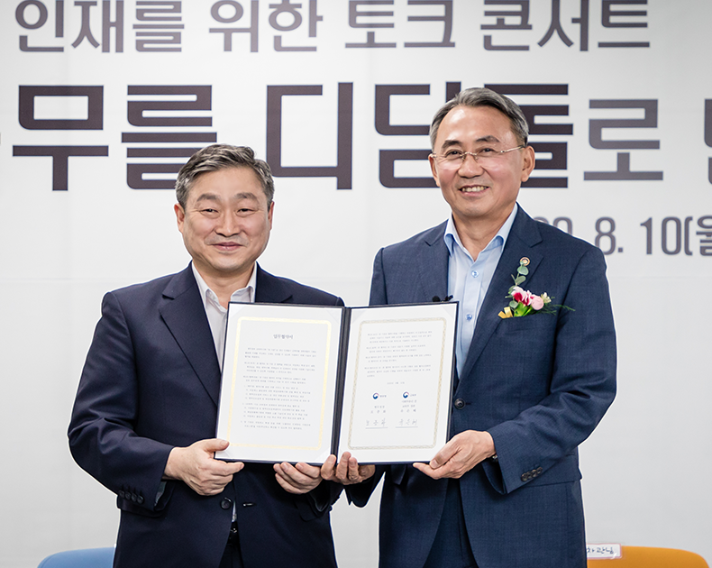 모종화 병무청장과 박백범 교육부 차관이 세종시 중앙취업센터에서 병역진로설계 및 취업맞춤특기병 활성화 업무협약을 체결한 뒤 기념촬영을 하고 있다.(8월 10일, 세종 중앙취업센터)