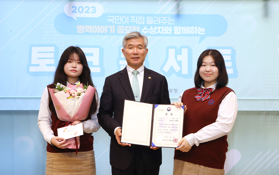 병무청장과 학생부문 대상 수상자의 기념촬영