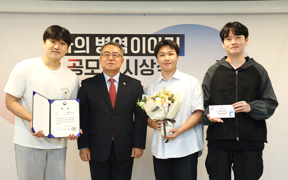 병무청장과 학생부문 대상 수상자의 기념촬영