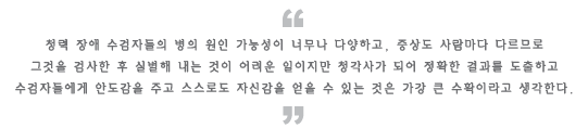 û·Â Àå¾Ö ¼ö°ËÀÚµéÀÇ º´ÀÇ ¿øÀÎ °¡´É¼ºÀÌ ³Ê¹«³ª ´Ù¾çÇϰí, Áõ»óµµ »ç¶÷¸¶´Ù ´Ù¸£¹Ç·Î ±×°ÍÀ» °Ë»çÇÑ ÈÄ ½Äº°ÇØ ³»´Â °ÍÀÌ ¾î·Á¿î ÀÏÀÌÁö¸¸ û°¢»ç°¡ µÇ¾î Á¤È®ÇÑ °á°ú¸¦ µµÃâÇÏ°í ¼ö°ËÀڵ鿡°Ô ¾Èµµ°¨À» ÁÖ°í ½º½º·Îµµ ÀڽۨÀ» ¾òÀ» ¼ö ÀÖ´Â °ÍÀº °¡Àå Å« ¼öÈ®À̶ó°í »ý°¢ ÇÑ´Ù.