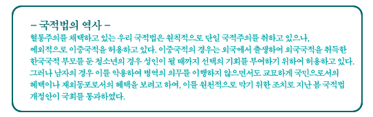 Ç÷ÅëÁÖÀǸ¦ äÅÃÇϰí ÀÖ´Â ¿ì¸® ±¹Àû¹ýÀº ¿øÄ¢ÀûÀ¸·Î ´ÜÀϱ¹ÀûÁÖÀǸ¦ ÃëÇϰí ÀÖÀ¸³ª, ¿¹¿ÜÀûÀ¸·Î ÀÌÁß±¹ÀûÀ» Çã¿ëÇϰí ÀÖ´Ù. ÀÌÁß±¹ÀûÀÇ °æ¿ì´Â ¿Ü±¹¿¡¼ Ãâ»ýÇÏ¿© ¿Ü±¹±¹ÀûÀ» ÃëµæÇÑ Çѱ¹±¹Àû ºÎ¸ð¸¦ µÐ û¼Ò³âÀÇ °æ¿ì ¼ºÀÎÀÌ µÉ ¶§±îÁö ¼±ÅÃÀÇ ±âȸ¸¦ ºÎ¿©Çϱâ À§ÇÏ¿© Çã¿ëÇϰí ÀÖ´Ù. ±×·¯³ª ³²ÀÚÀÇ °æ¿ì À̸¦ ¾Ç¿ëÇÏ¿© º´¿ªÀǹ«¸¦ ÀÌÇàÇÏÁö ¾ÊÀ¸¸é¼µµ ±³¹¦ÇÏ°Ô ±¹¹ÎÀ¸·Î¼ÀÇ ÇýÅÃÀ̳ª Àç¿Üµ¿Æ÷·Î¼ÀÇ ÇýÅÃÀ» º¸·Á°í ÇÏ¿©, À̸¦ ¿øÃµÀûÀ¸·Î ¸·±â À§ÇÑ Á¶Ä¡·Î Áö³ º½ ±¹Àû¹ý °³Á¤¾ÈÀÌ ±¹È¸¸¦ Åë°úÇÏ¿´´Ù. µ¿ ¹ýÀÌ ½ÃÇà¿¡ À̸£ÀÚ ±× ÇýÅÃÀÇ »ó½ÇÀ» ¿ì·ÁÇÑ Àڵ鿡 ÀÇÇÏ¿© ±¹ÀûÀÌÅ»ÀÇ ¹®Á¦°¡ ºÒ°ÅÁ³´Ù.