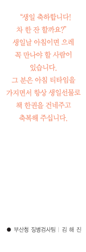 Àº Áö³ÇغÎÅÍ ºÎ»êû¿¡¼ º¼ ¼ö ÀÖ´Â ¾ÆÄ§Ç³°æÀÔ´Ï´Ù. Á÷¿øµéÀÌ ÀÚ½ÅÀÌ °¡Àå ÀÐ°í ½ÍÀº Ã¥À» ¼±Á¤Çϸé, ÀÌ»Ú°Ô Æ÷ÀåµÈ ±× Ã¥À» »ýÀϳ¯ ûÀå´ÔÀ¸·ÎºÎÅÍ ¾ÆÄ§ ÃàÇϸ޼¼Áö¿Í ÇÔ²² ¹Þ°Ô µË´Ï´Ù. ±×·¡¼ ¿ì¸®µéÀº »ýÀÏÀÌ ´Ù°¡¿À¸é ¾î¶² Ã¥ÀÌ ÁÁÀ»±î Áñ°Å¿î °í¹ÎÀ» ÇÏ°Ô µÇ¾úÁö¿ä. °¢±â°ü¿¡¼ ¼±Á¤ÇÑ Ã¥, ³×ƼÁðµéÀÌ ÃßõÇÑ Ã¥, ÁÖÀ§¿¡¼ Àо°í ±ÇÇØÁִ å µî ´Ù¹æ¸éÀ¸·Î ÁÁÀº Ã¥µéÀ» °Ë»öÇØ º¸°Ô µÇ¾ú½À´Ï´Ù. ±×·¡¼ 2007³â µ¿¾È ¿ì¸®°¡ Àоú´ø Ã¥µéÀº ´©±¸¶óµµ ²À Çѹø Àо¾Æ¾ß ÇÒ Ãßõµµ¼¸ñ·ÏÀÌ µÈ ¼ÀÀÔ´Ï´Ù. 2008³â ¹«ÀÚ³âÀ» ¸ÂÀÌÇÏ¿© ´õ ¸ÚÁø ³»°¡ µÇ°í, ´õ ´É·ÂÀ» ÀÎÁ¤¹Þ°í, ´õ ºÎÀڵǰí, ´õ ÇູÇÑ °¡Á¤À» ¸¸µé¾î °¡¸®¶ó ´Ùµé ´ÙÁüÇÏ°í °èȹÀ» ¼¼¿öº¸¼ÌÀ¸¸®¶ó »ý°¢ÇÕ´Ï´Ù. ÀÌ·¯ÇÑ ²ÞµéÀ» ¿Ã ÇÑÇØ ÀÌ·ç±â À§ÇØ ¡®µ¶¼¡¯¶ó´Â ³à¼®°ú Ä£ÇØÁ® ¿ì¸®ÀÇ Á¤½ÅÀ» »ìÂî¿ì´Â ¹Ø°Å¸§À¸·Î »ï¾Æº¸¸é ¾î¶³±î¿ä?